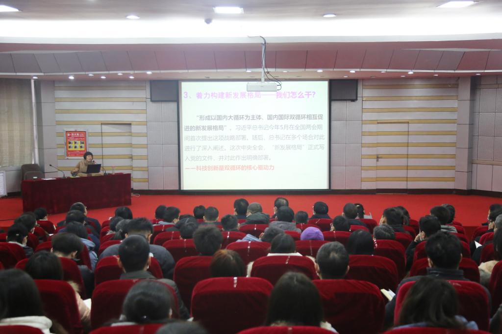 12月16日下午,我校在锦江之星学术报告厅举办党的十九届五中全会精神专题辅导报告会。中共河南省委党校法学教研部经济法教研室主任涂永珍教授应邀为我校师生作报告。校党委副书记吴建军、副校长牛晓玉出席,全体中层领导人员、校党委各部室全体党员以及各学院、各部门师生党员代表400余人参加报告会。党委一区一区三区中部长齐献军主持报告会。