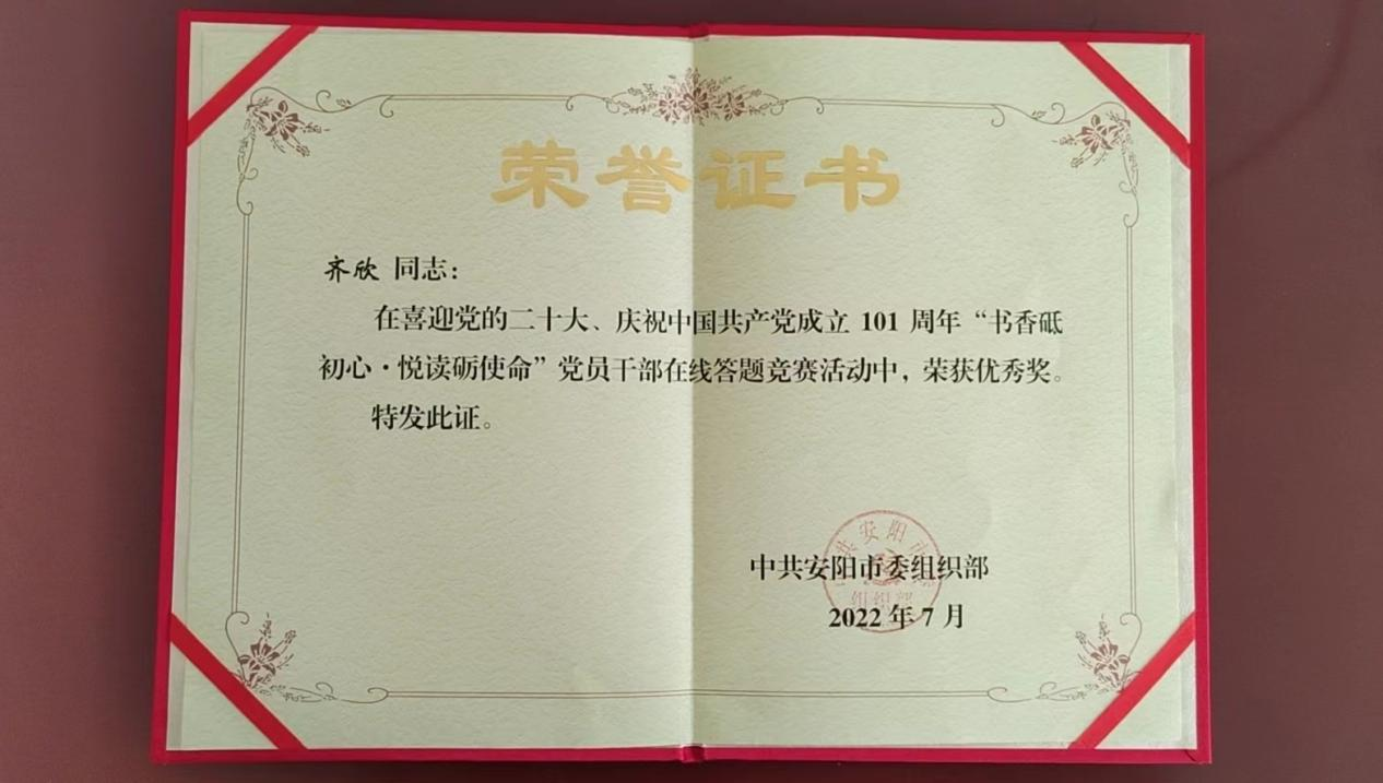 为迎接党的二十大召开,庆祝中国共产党成立101周年,深入推进能力作风建设年活动以及党史学习教育常态化长效化,2022年6月6日至15日,安阳市委一区一区三区中依托《安阳党建》微信公众号,面向全市各级党组织和广大党员干部开展了喜迎党的二十大,庆祝建党101周年“书香砥初心·悦读砺使命”在线答题竞赛活动,累计近16万人次主动参与了答题活动。近日,中共安阳市委一区一区三区中对答题竞赛成绩优秀的100名同志进行通报表扬,我校商学院齐欣老师荣获个人优秀奖。